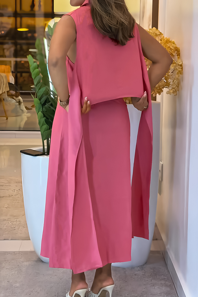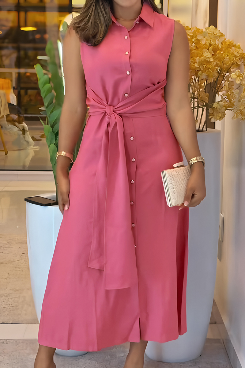 Pink Casual Solid Color Buckle Strap Design Turndown Collar Long Dresses
