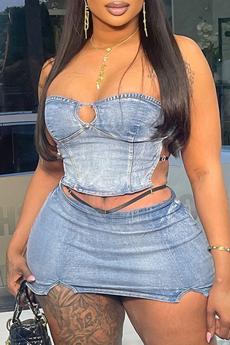Blue Sexy Solid Color Backless Zipper Strapless Sleeveless Two Pieces