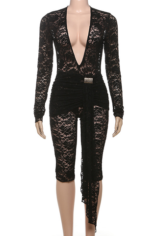 Black Sexy Solid Color Lace Ruched Deep V Neck Skinny Jumpsuits
