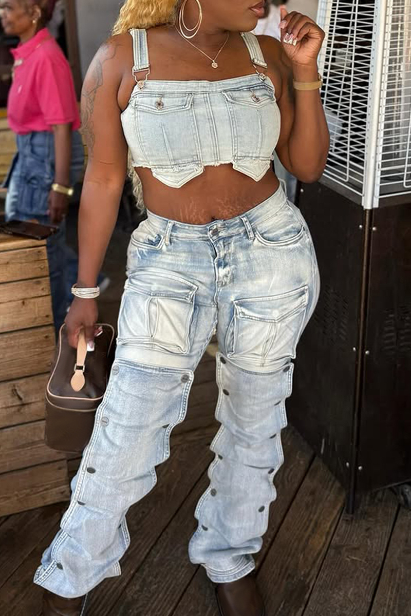 Blue Casual Solid Color Pocket Mid Waist Loose Denim Jeans