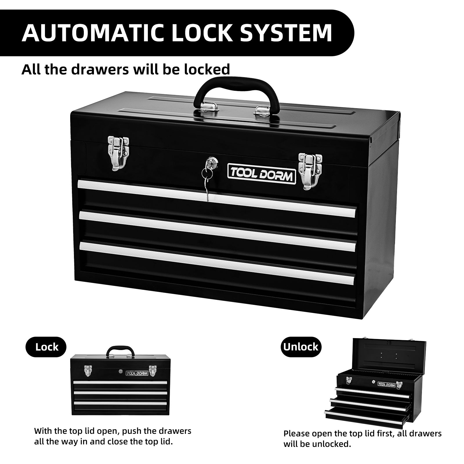 5. Drawers can be locked automatically when top lid is closed. This function prevent drawers from slipping out when being carried and for more effective tool storage