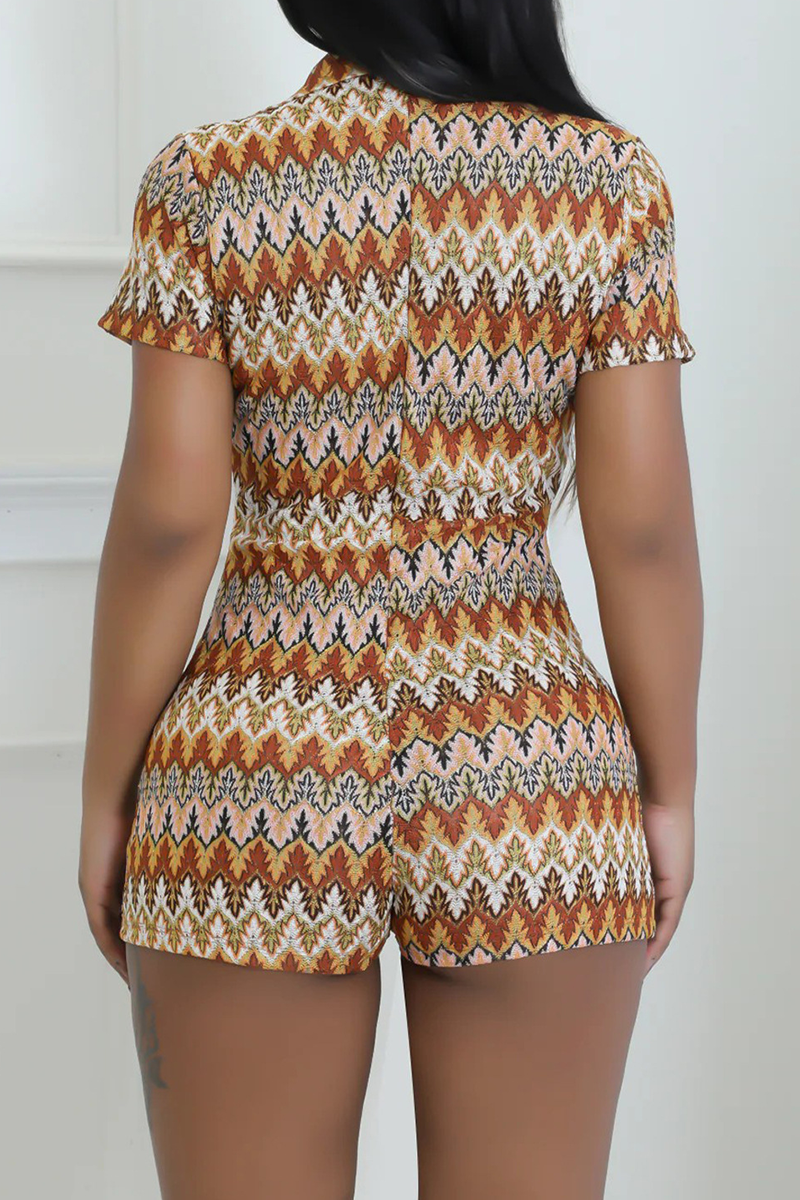 Gold Casual Print Buckle Turndown Collar Skinny Rompers
