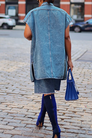 Blue Casual Solid Color Pocket Buckle Turndown Collar Short Sleeve Loose Denim Jacket
