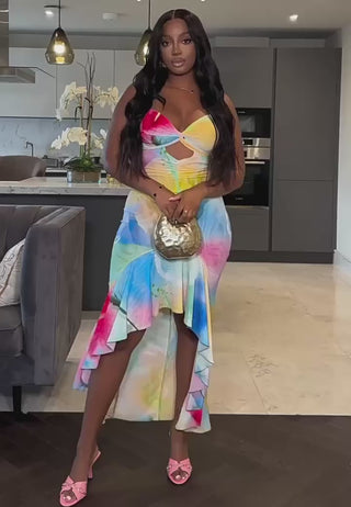 Colorblock Hollow-out Ruffle Split Hem Slip Dress
