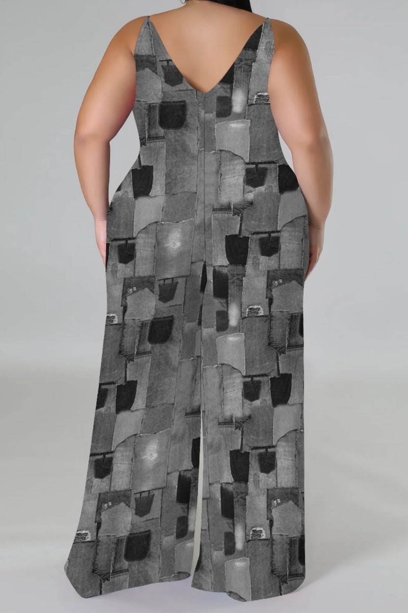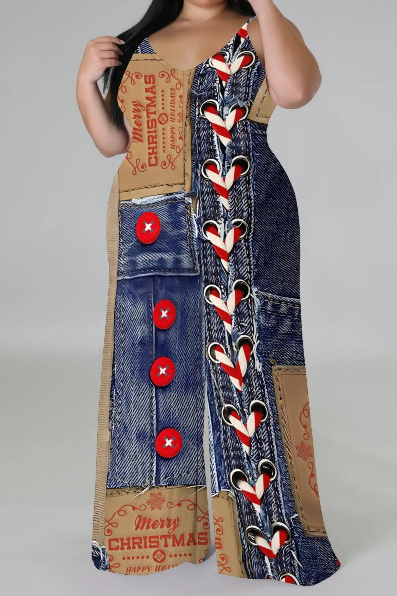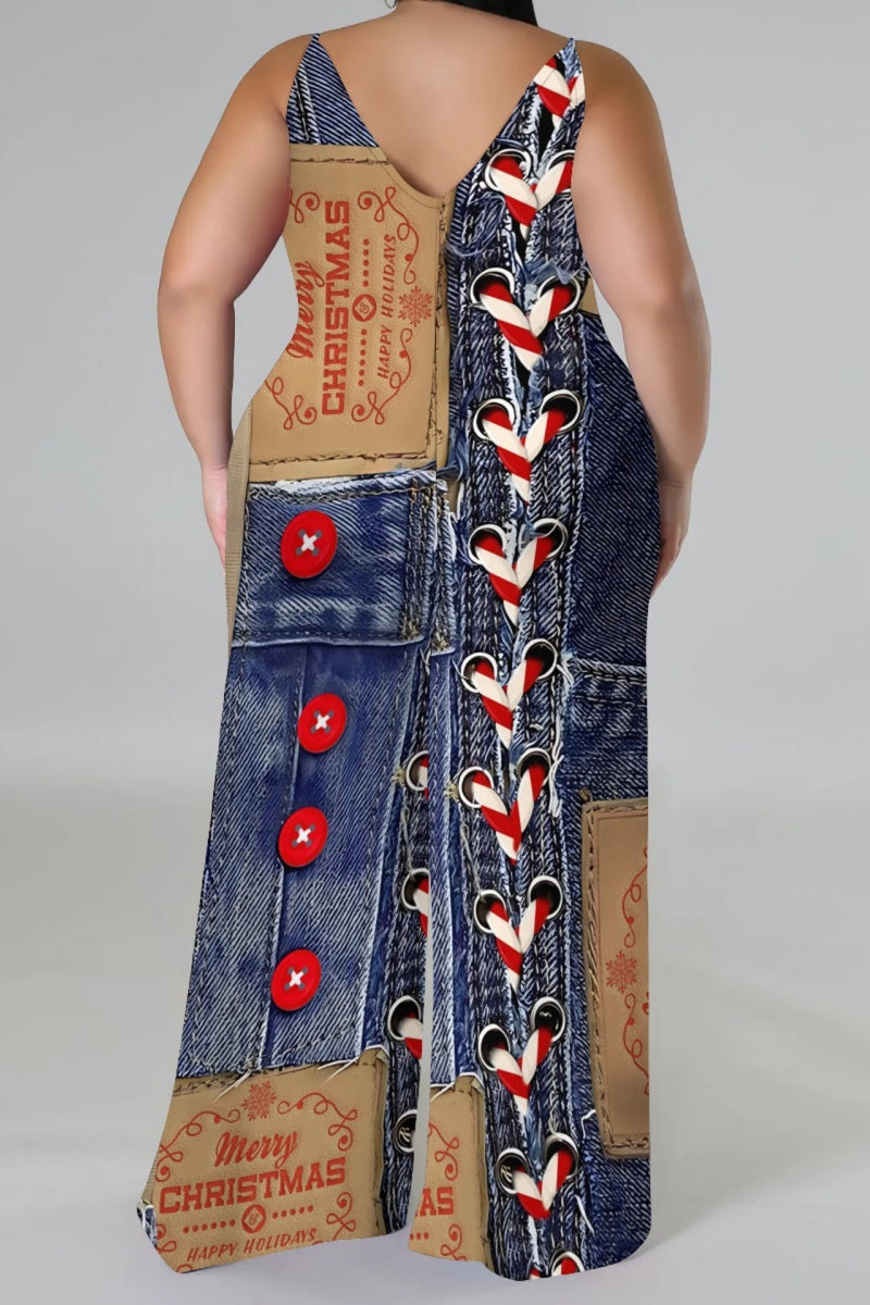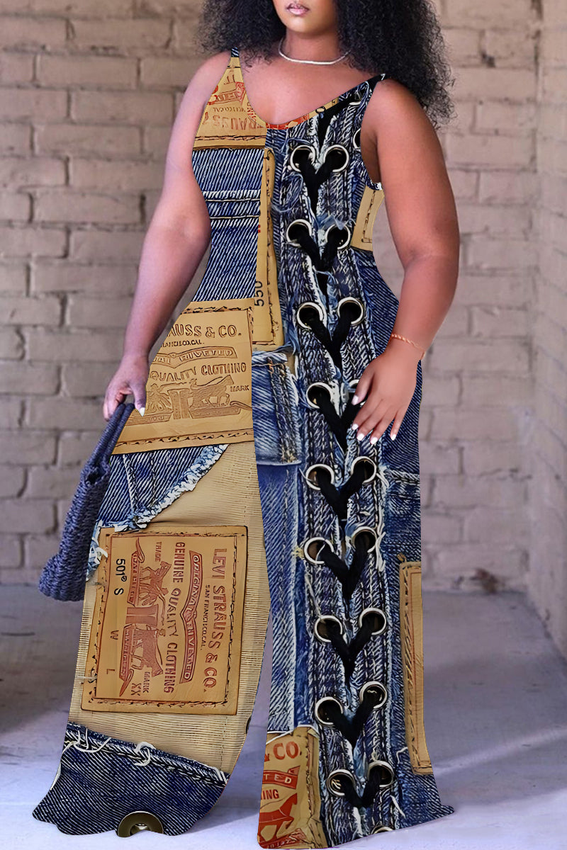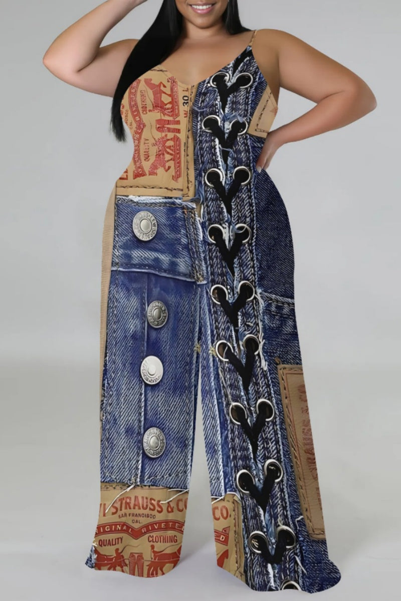 Blue Khaki Casual Faux Denim Print Sleeveless Backless Spaghetti Strap Plus Size Cami Wide Leg Jumpsuits (With Headscarf)