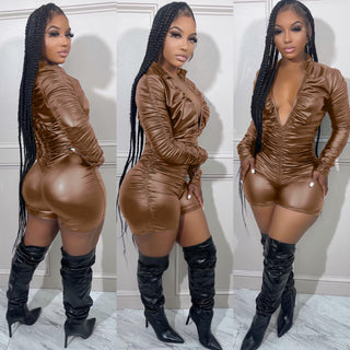 Women's Solid Color V-Neck Long Sleeve Ruched High Stretch Pu Leather Jumpsuit