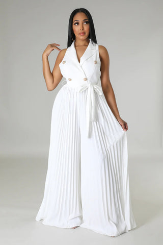 Women Spring V-neck Sleeveless Backless Pleated Wide Leg Jumpsuit