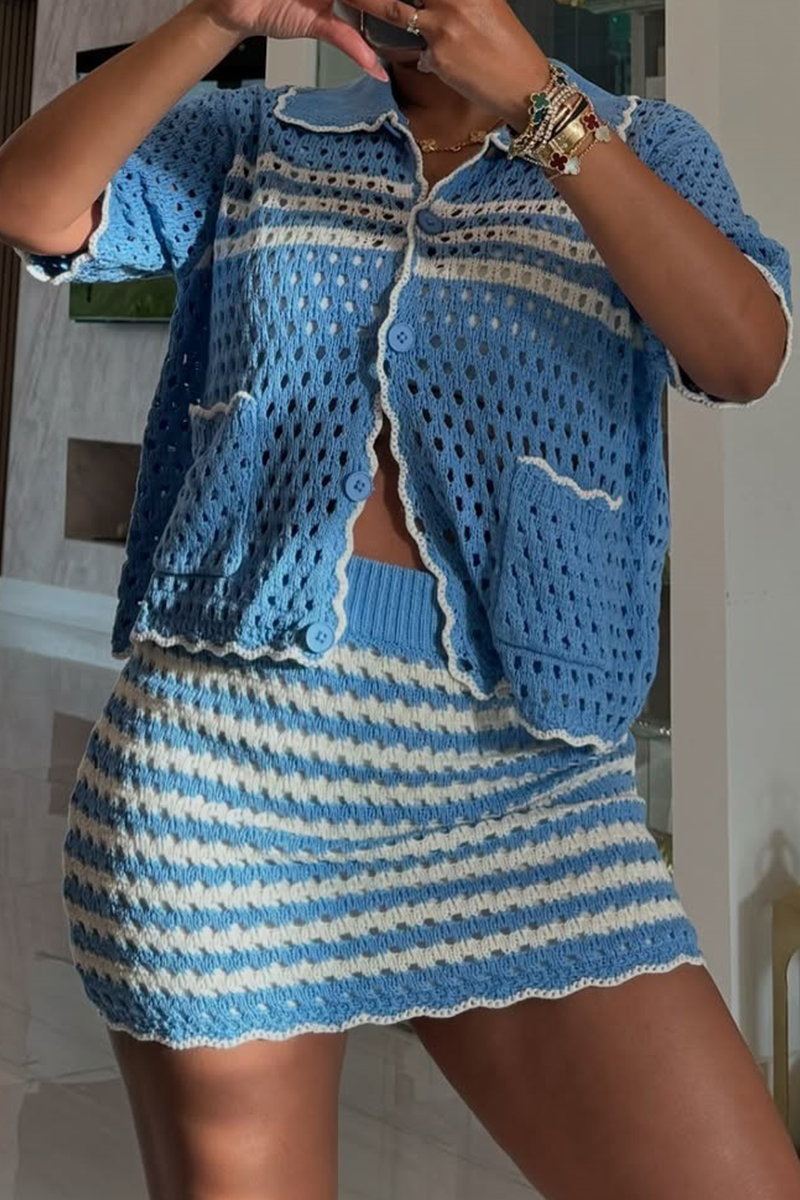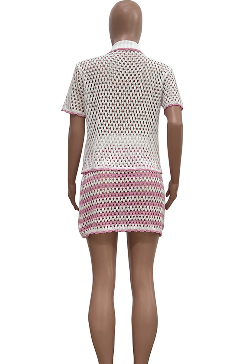 Pink Casual Stripe Pocket Buckle Turndown Collar Half Sleeve Two Pieces